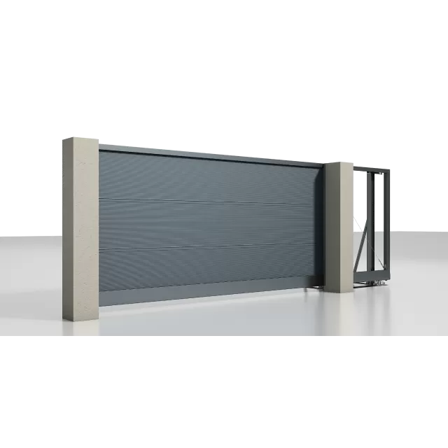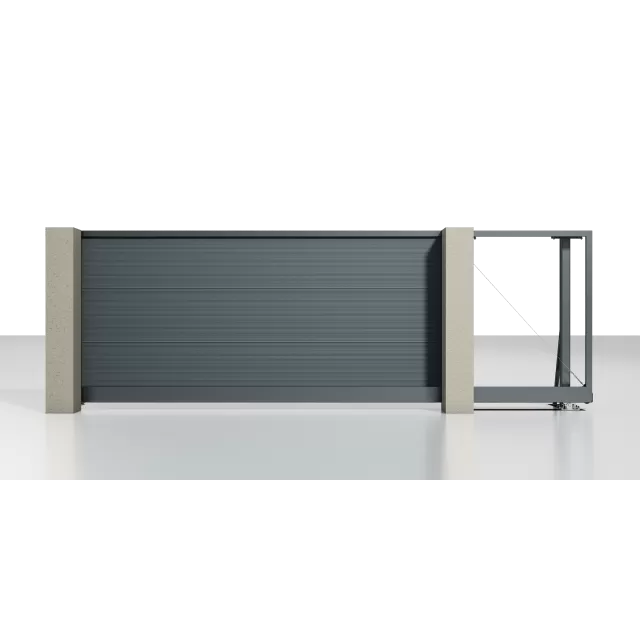 Рама: 96 мм. Комбинированное заполнение: сэндвич-панель L-гофр и разреженный профиль 37 мм. цвета «Серый антрацит» (RAL 7016). Автоматика ALUTECH Roteo